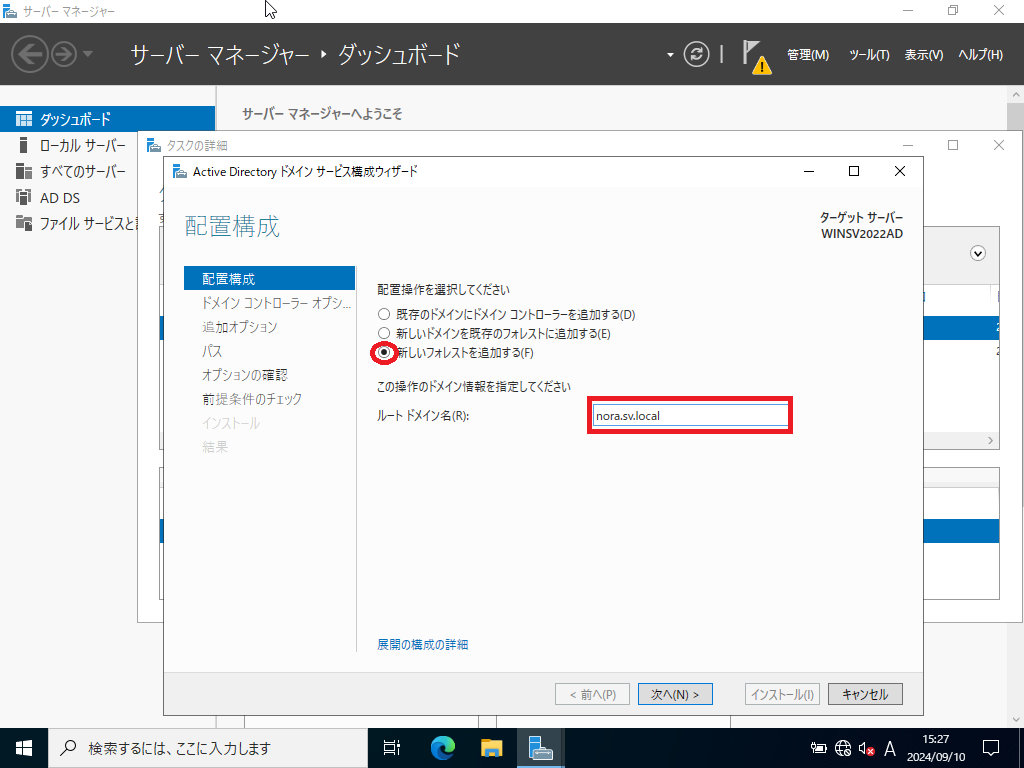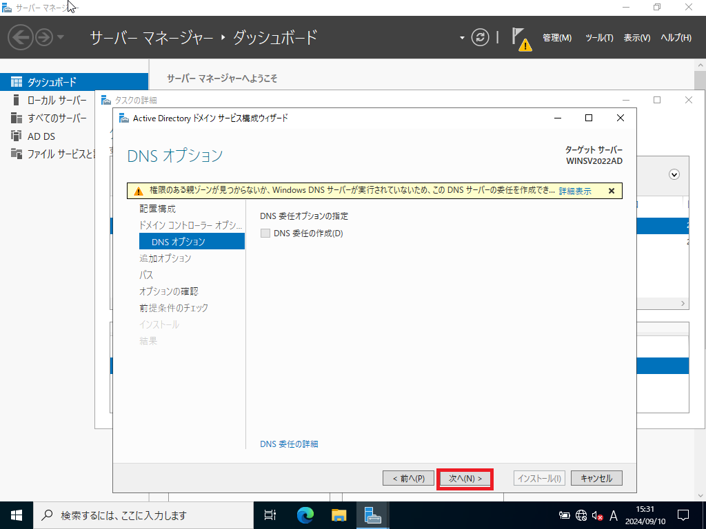 ⑴クライアントPCの「優先DNSサーバー」を前回までで構築したドメインコントローラーのアドレスを設定します。