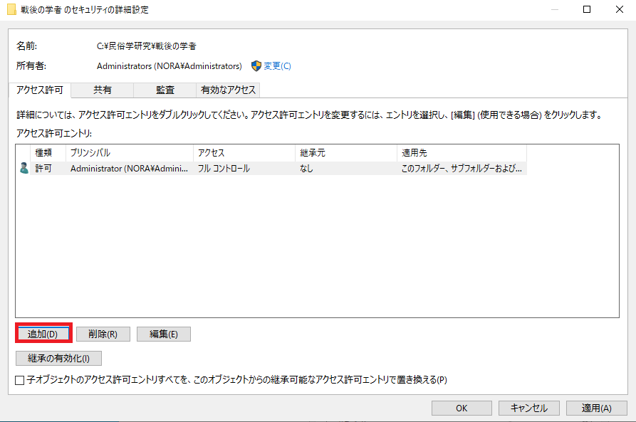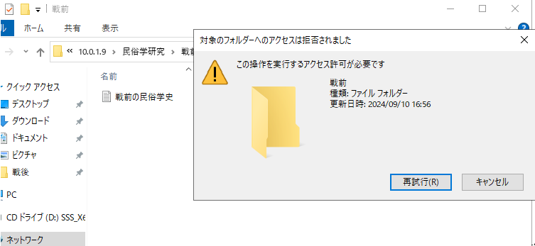 (24)上記の様なアクセス許可が必要な旨が表示され、「戦前」フォルダー内では書き込みが出来ないこと(書き込み権限が無い)を確認します。
