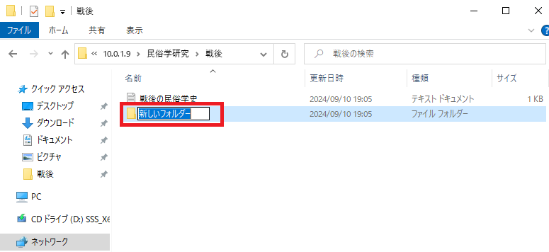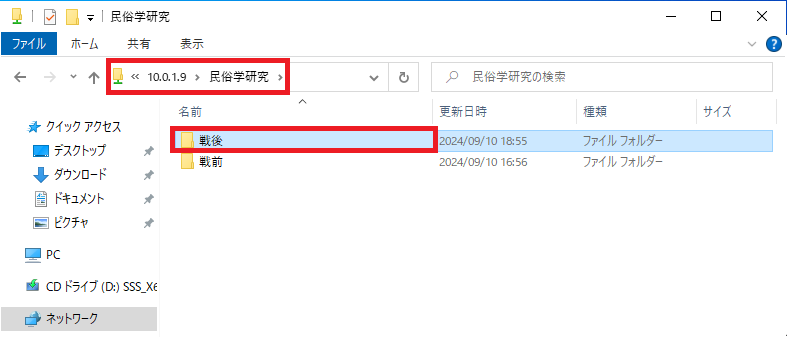 ⒀「民俗学研究」フォルダ内の「戦後」「戦前」フォルダがあることを確認し、「戦後」フォルダを開きます。