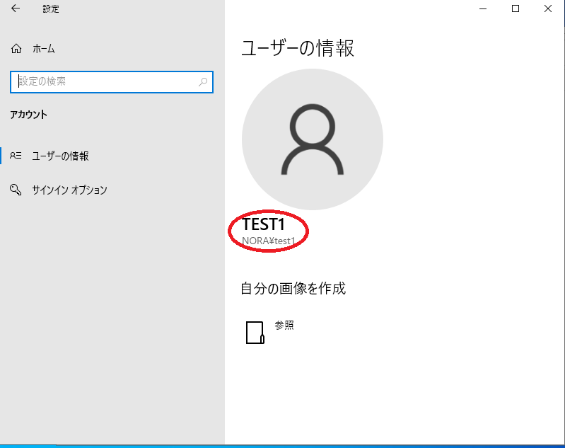 (41)Windowsのスタートメニューから「設定」>「ホーム」>「アカウント」で上記の「ユーザー情報」画面を起動し、ログインしたユーザーアカウント「NORA¥test1」名前「TEST1」であることを確認します。