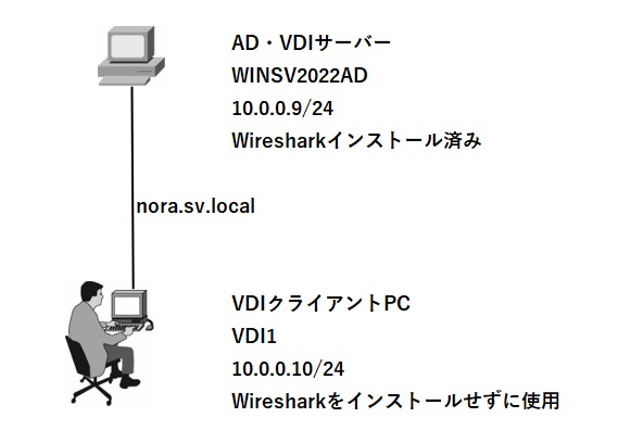 前回の構成図と同じで、クライアント側の設定を行うことで、WiresharkをインストールせずにクライアントからWiresharkを使えるようにします。なおWindows11のクライアントPCはドメイン参加済みです。