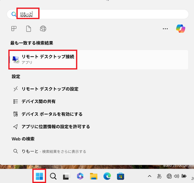 ⑴スタートボタンをクリックし、「りもーと」と検索を行い、リモートデスクトップを表示させます。