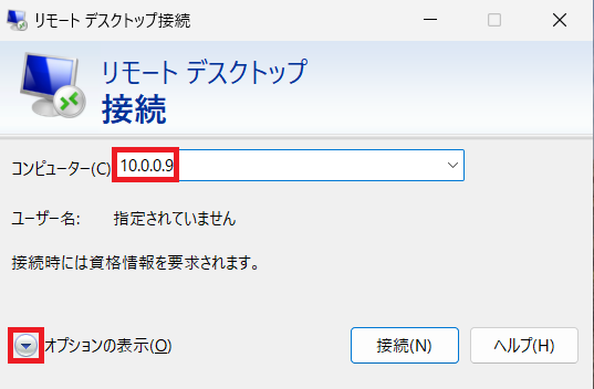 ⑵リモートデスクトップ接続起動後、コンピューターのテキストボックスにVDIサーバーのIPアドレスを入力し、「オプションの表示」をクリック。