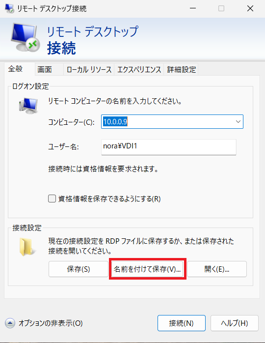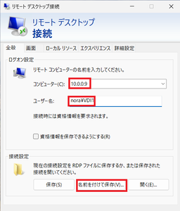 ⑶コンピューターのIPアドレスを確認後、ユーザー名のテキストボックスにVDIサーバーで設定したアカウント(ドメイン名¥ユーザー名)を入力して「名前を付けて保存」をクリック。