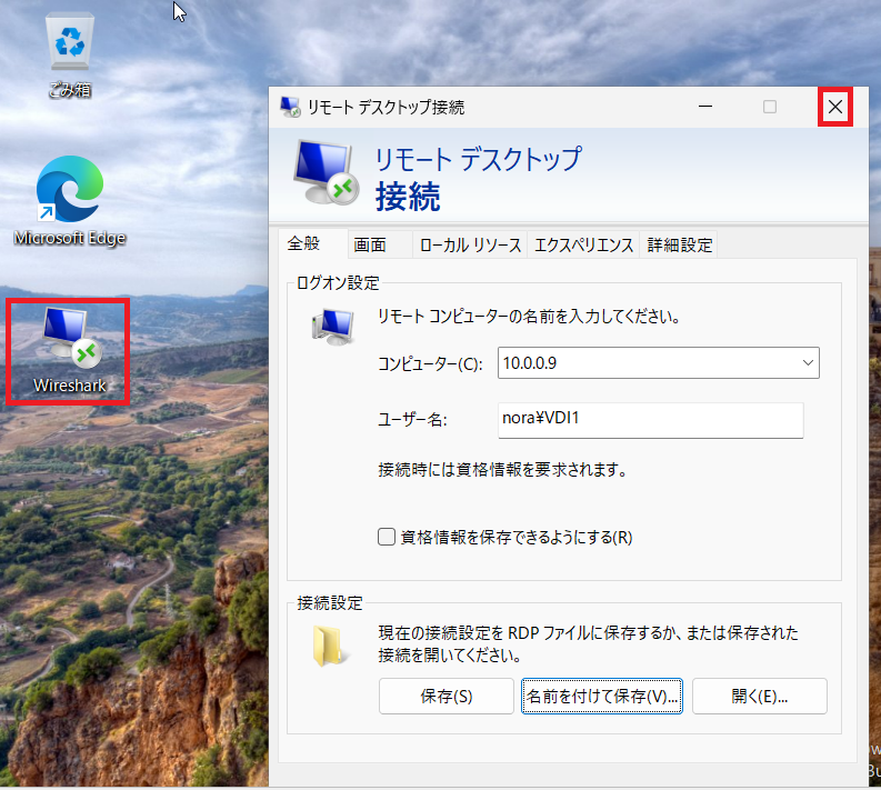 ⑸デスクトップ上に作成したRDPファイルが存在することを確認出来たら、リモートデスクトップ接続の画面の「×」をクリックして閉じます。