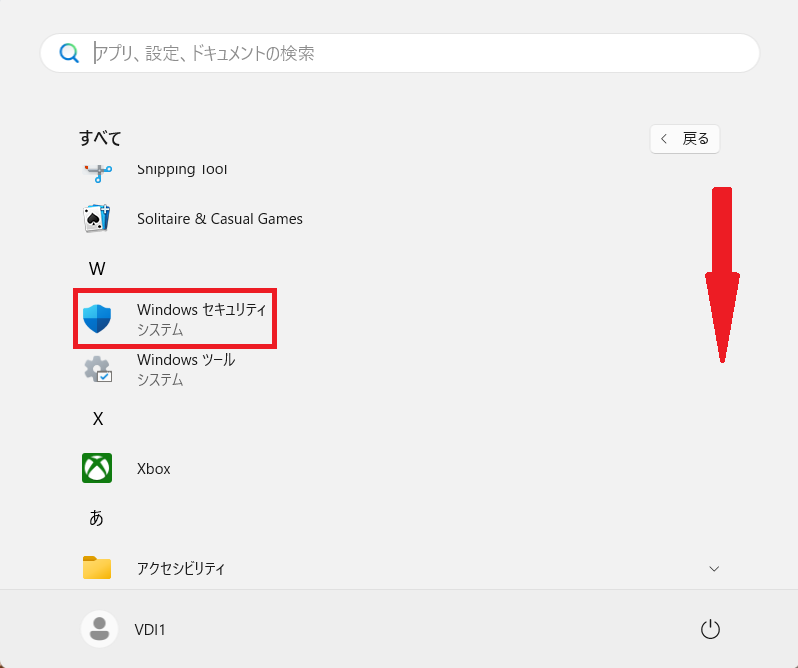 ⑵下にスクロールし、「Windows セキュリティ」をクリック。
