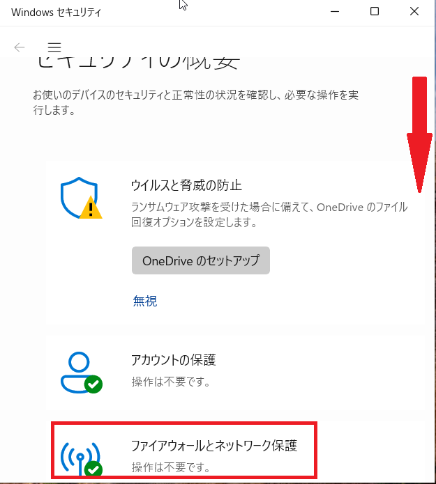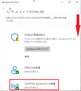⑶セキュリティの概要画面で下にスクロールし、「ファイアウォールとネットワークの保護」をクリック。