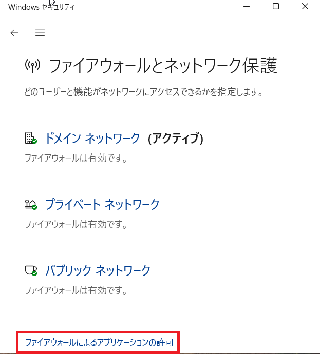 ⑷ファイアウォールとネットワークの保護の画面で「ファイアウォールによるアプリケーションの許可」をクリック。