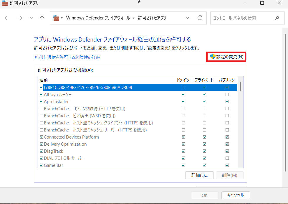 ⑸許可されたアプリ画面の「設定の変更」をクリック。