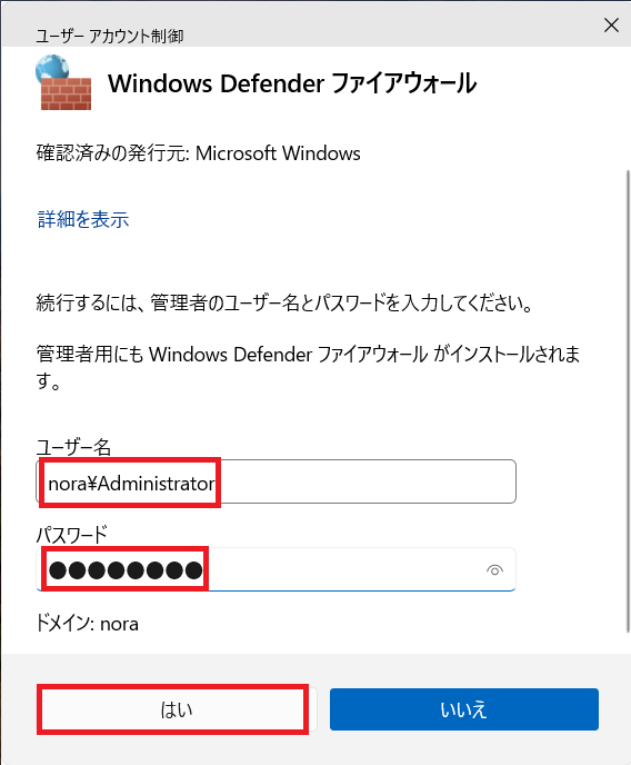 ⑹管理者のアカウントの「ユーザー名」と「パスワード」を入力し、「はい」をクリック。