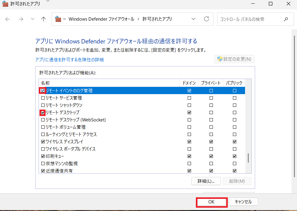 ⑺「リモートイベントログの管理」及び「リモートデスクトップ」にチェックを入れ、「OK」をクリック。
