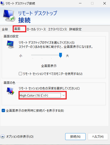 ⑴リモートデスクトップ接続の設定時に、「画面」タブをクリックし、画面の色を「High Color(16ビット)」に変更。