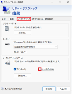 ⑵「ローカルリソース」タブをクリックし、「クリップボード」のチェックを外します。