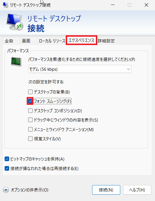 ⑶「エクスペリエンス」タブをクリックし、パフォーマンスを「モデム(56 Mbps)」に変更し、「フォントスムージング」のみチェック」します。
