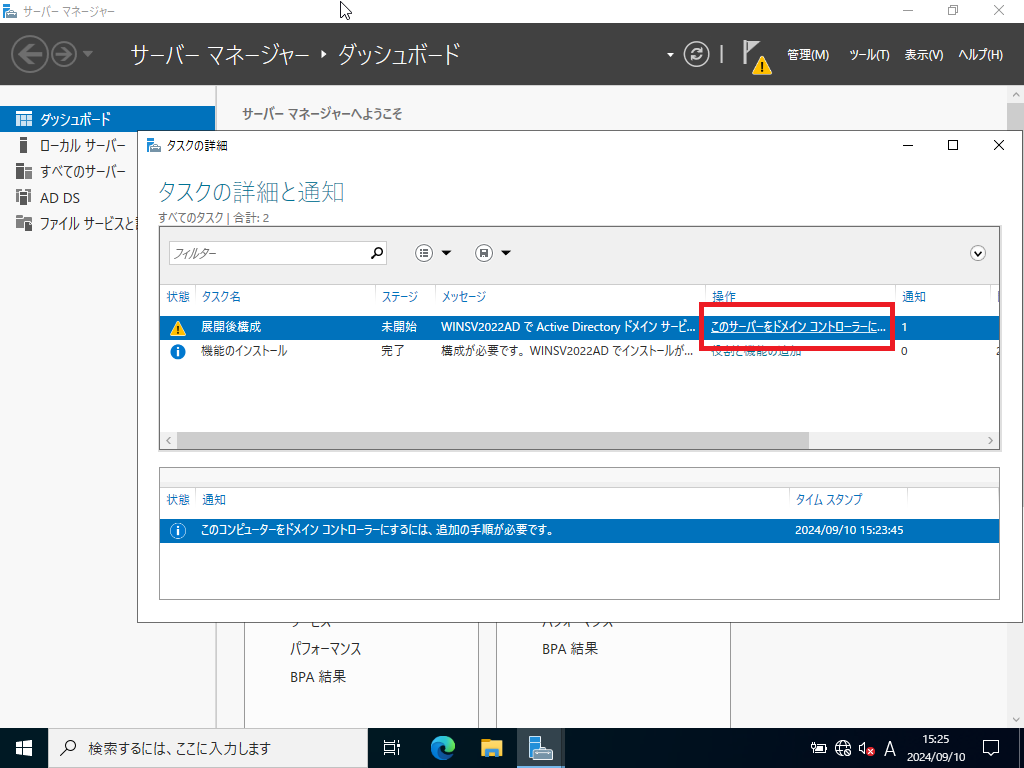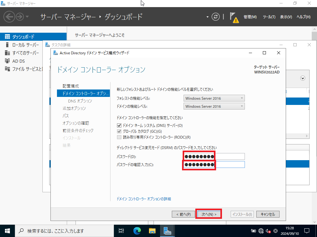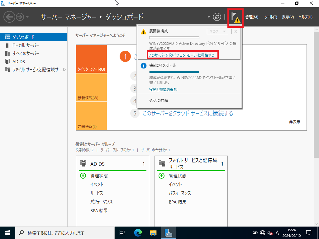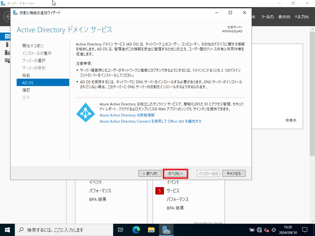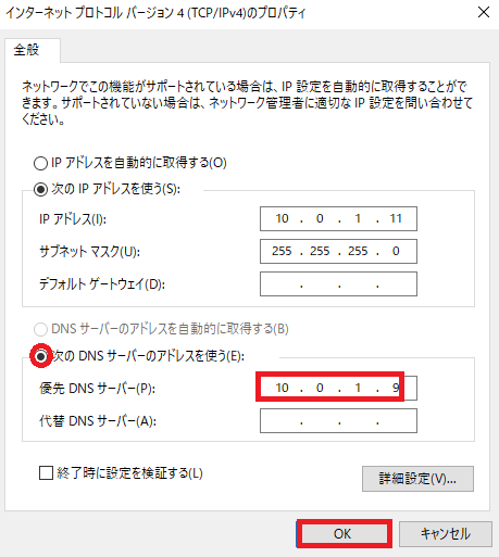 ⑴クライアントPCの「優先DNSサーバー」を前回までで構築したドメインコントローラーのアドレスを設定します。