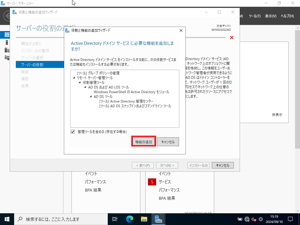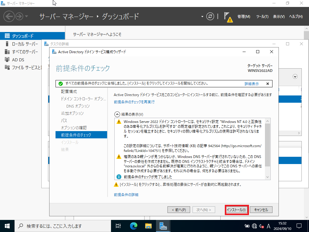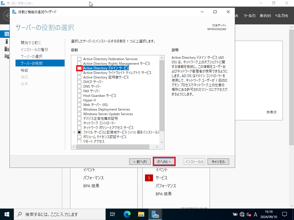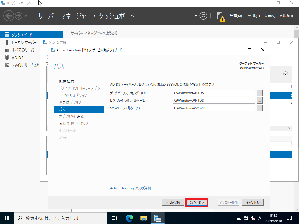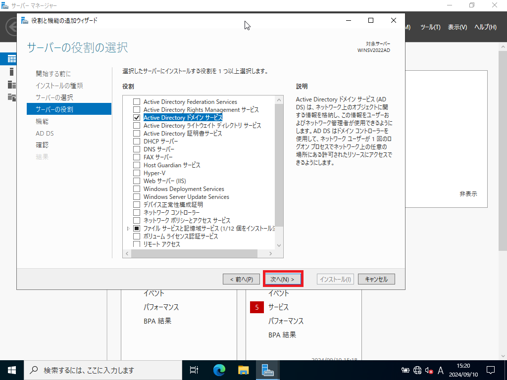 ⑴クライアントPCの「優先DNSサーバー」を前回までで構築したドメインコントローラーのアドレスを設定します。