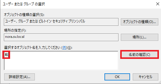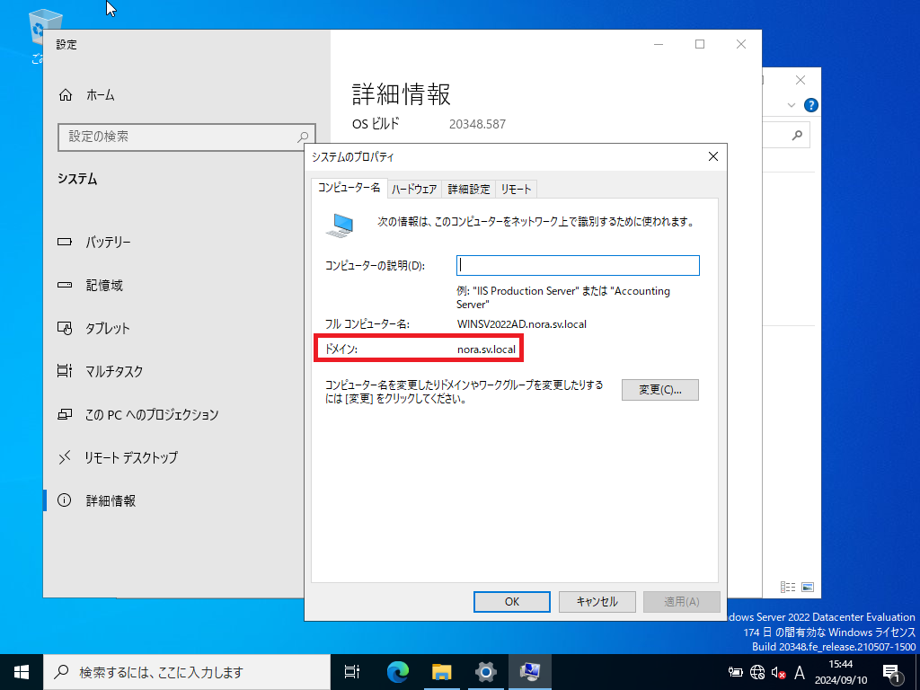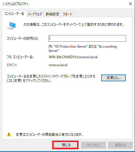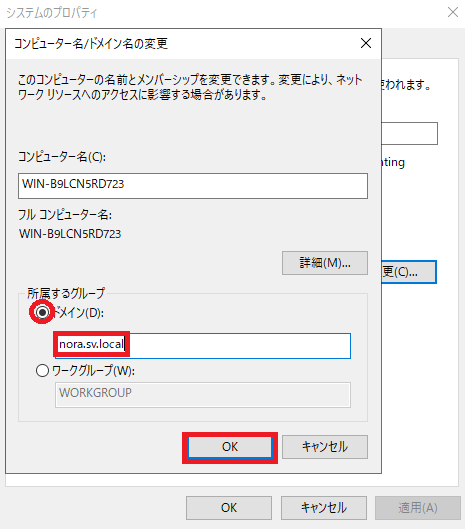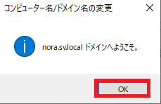 ⑶「コンピューター名/ドメイン名の変更」画面起動後、「所属するグループ」のドメインのラジオボタンを選択し、テキストボックスにドメイン名(nora.sv.local)を入力し、「OK」をクリック。