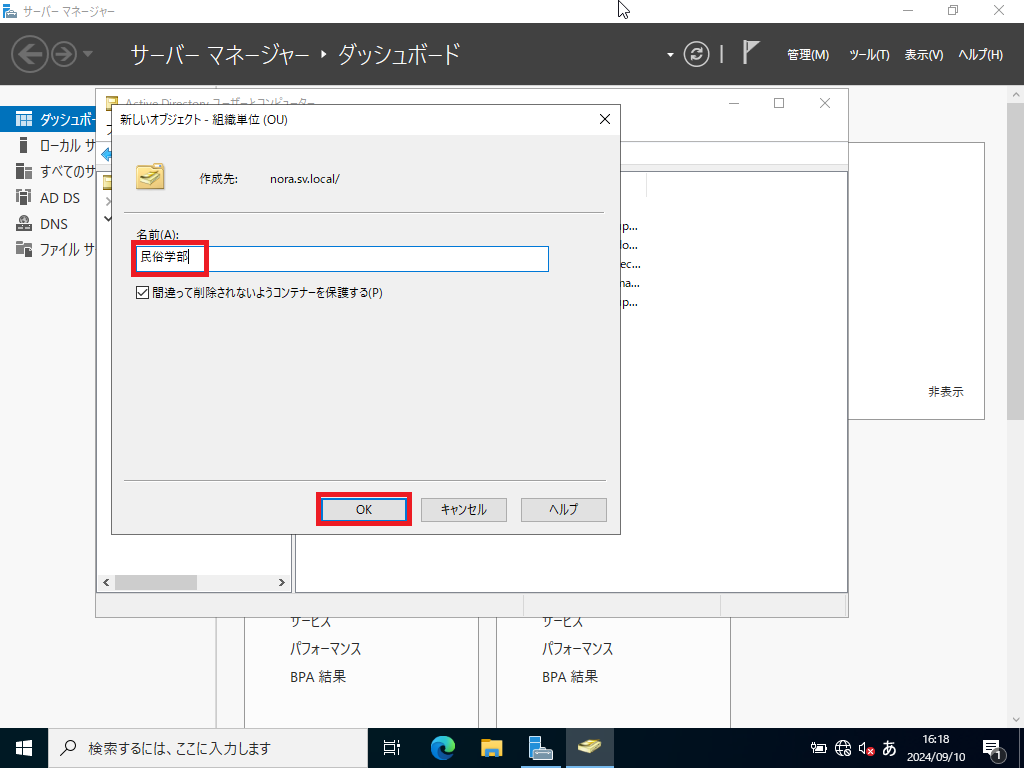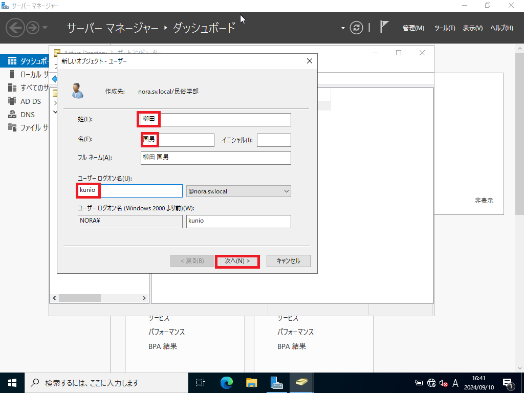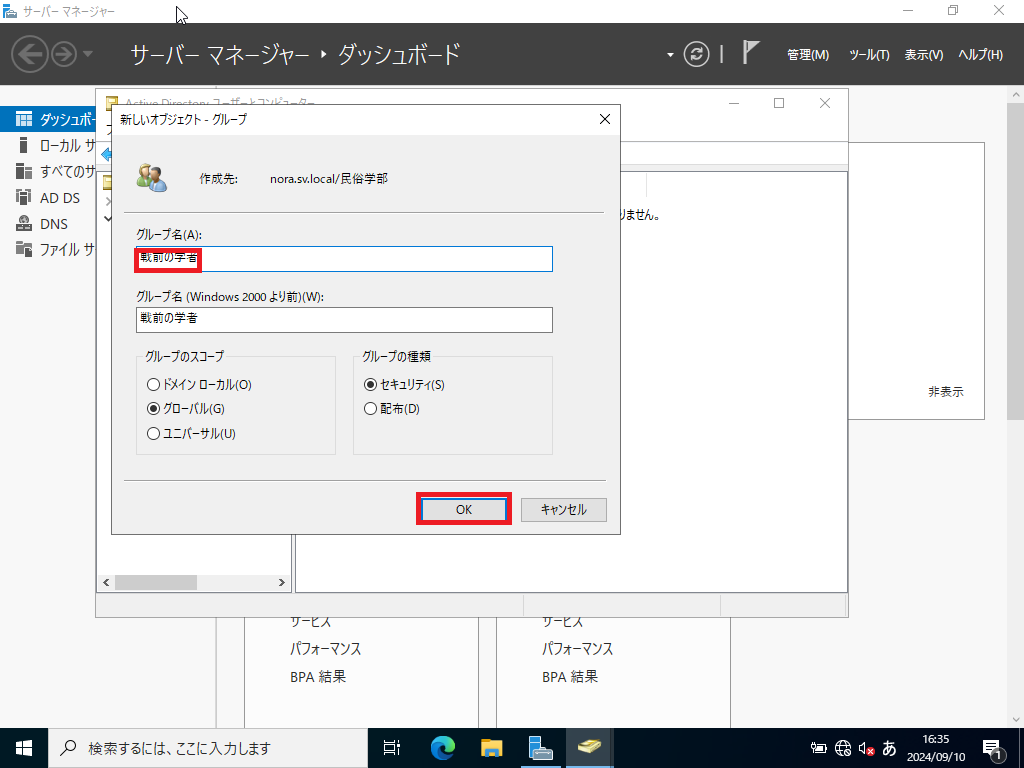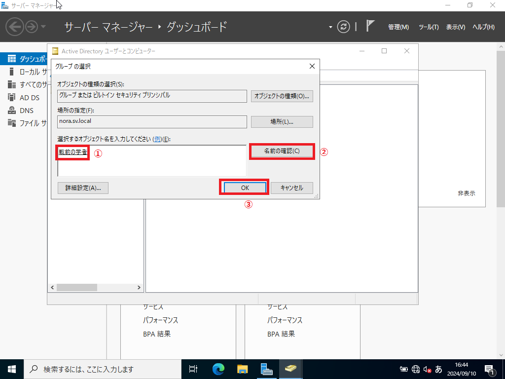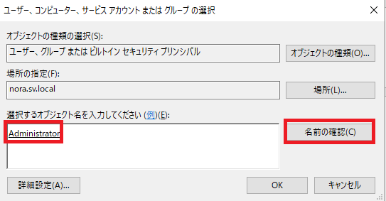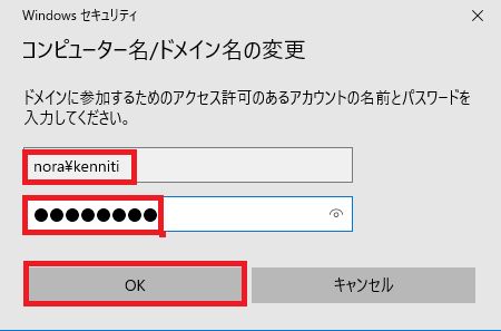 ⑷「Windowsセキュリティ」画面が起動するので、[ Active directory 構築➁ ユーザーアカウント、グループ、OUの設定 ]アカウント名(今回はnora¥kenniti)とパスワードを入力し、「OK」をクリック。