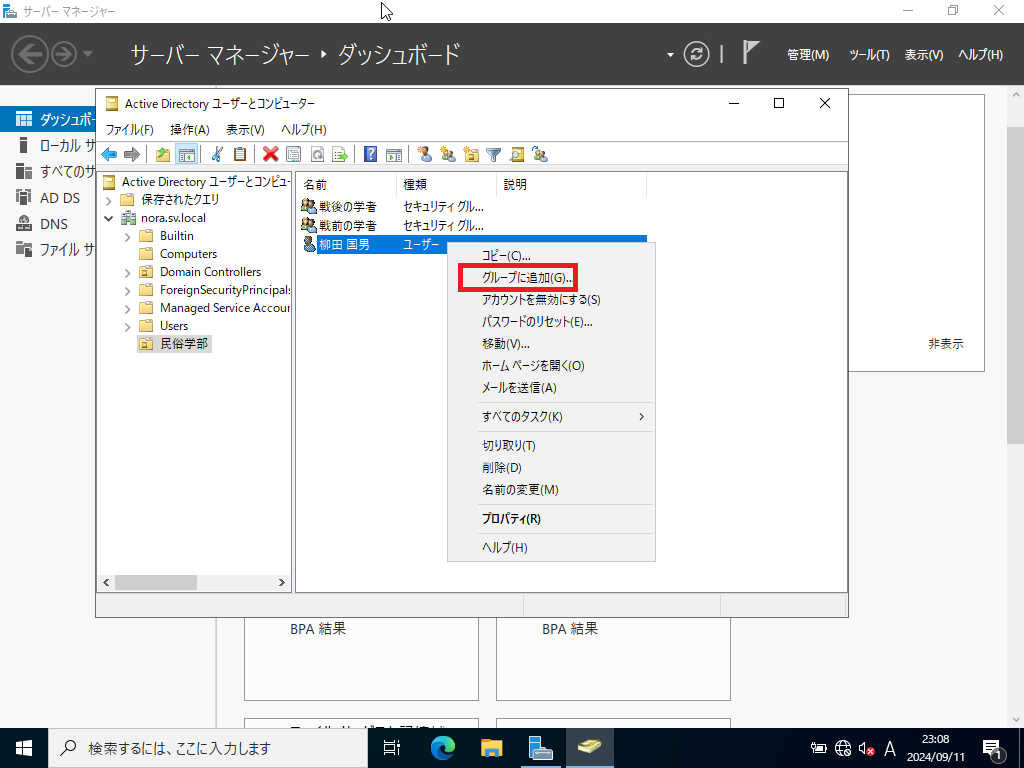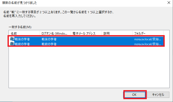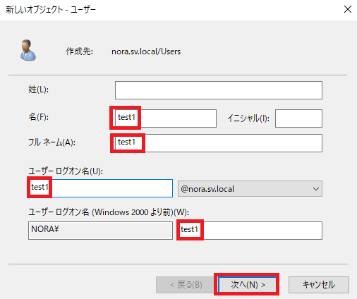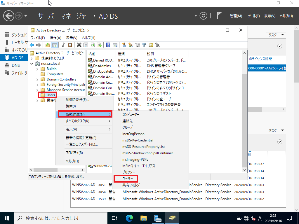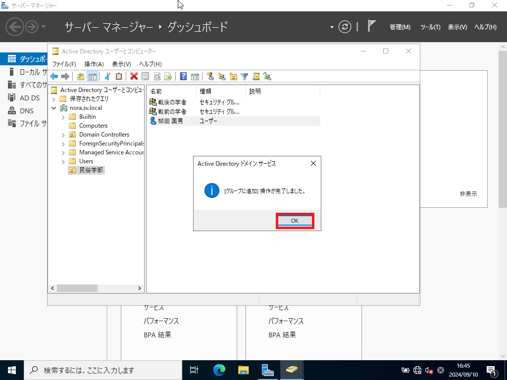 ⑷「Windowsセキュリティ」画面が起動するので、[ Active directory 構築➁ ユーザーアカウント、グループ、OUの設定 ]アカウント名(今回はnora¥kenniti)とパスワードを入力し、「OK」をクリック。