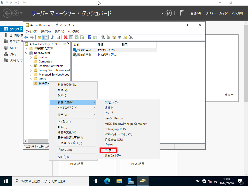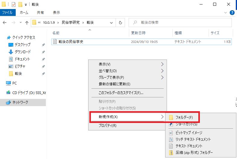 (37)「戦後」フォルダー内で右クリックし、「新規作成」」>「フォルダー」をクリックします。