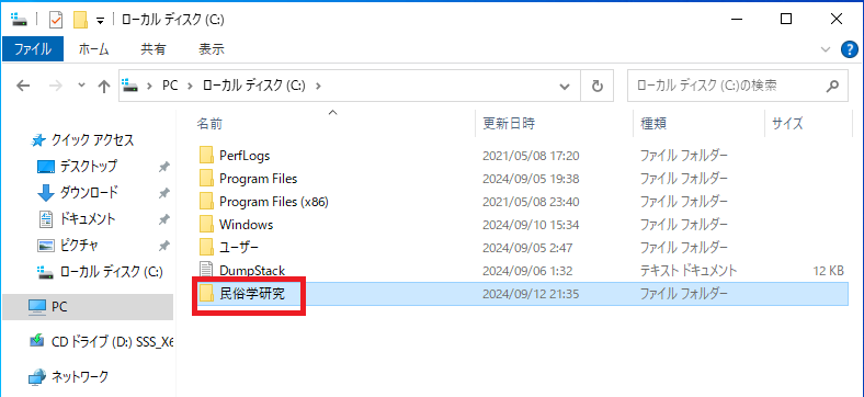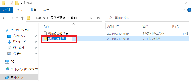 (32)「新しいフォルダー」が作成出来ること(書き込み権限)を確認後、「民俗学研究」フォルダーへ戻ります。