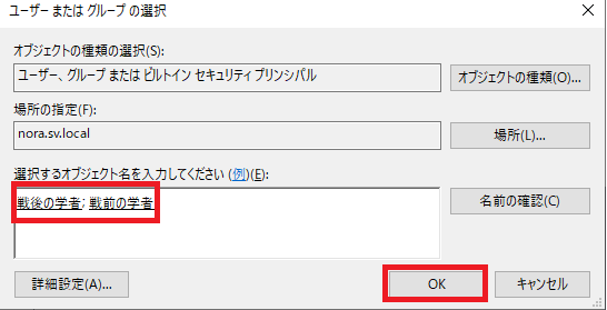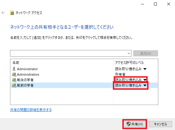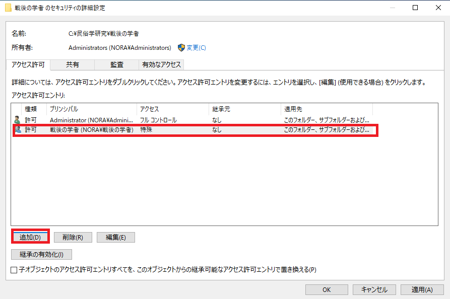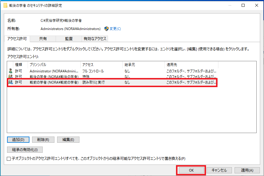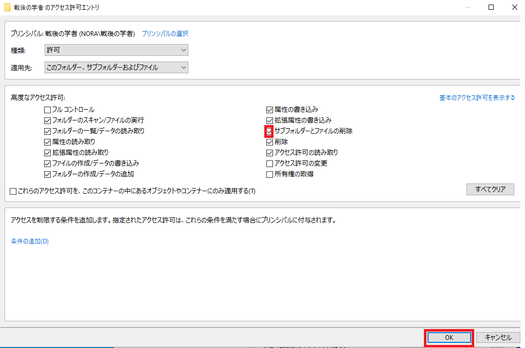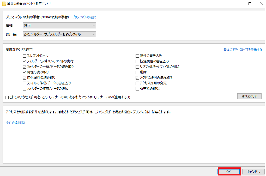 *特殊は(「読み取り」、「書き込み」、「サブフォルダーとファイルの削除」含む。)