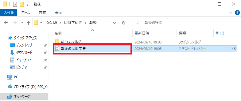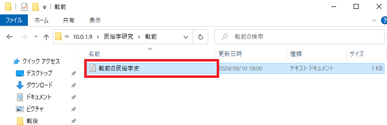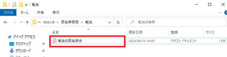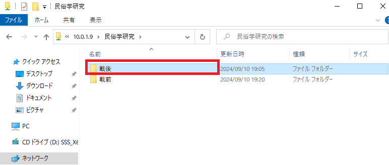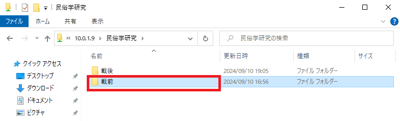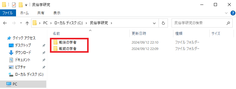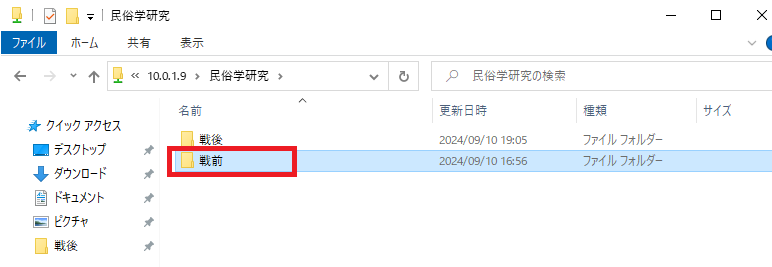 ⒀「民俗学研究」フォルダ内の「戦後」「戦前」フォルダがあることを確認し、「戦後」フォルダを開きます。
