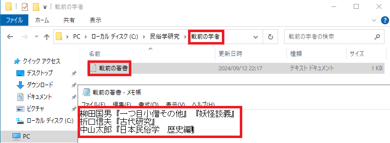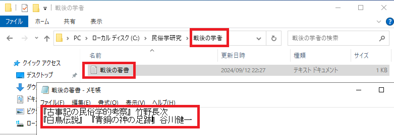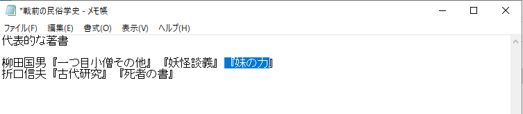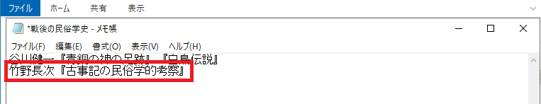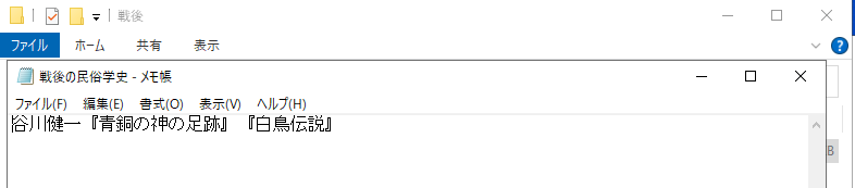 ⒁「戦後」フォルダ内の「戦後の民俗学史」テキストファイルを開きます。