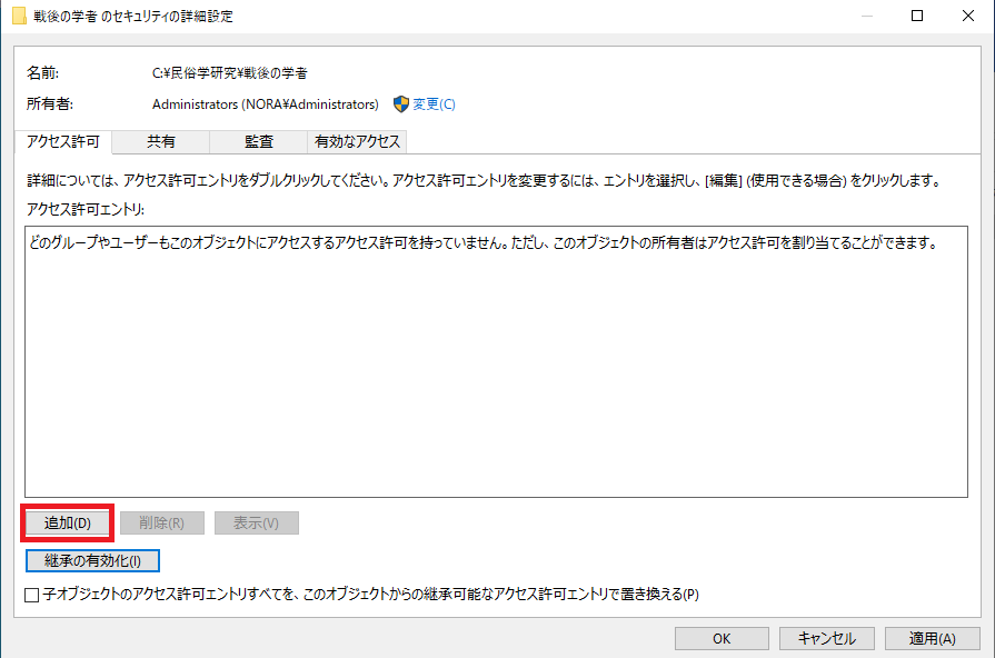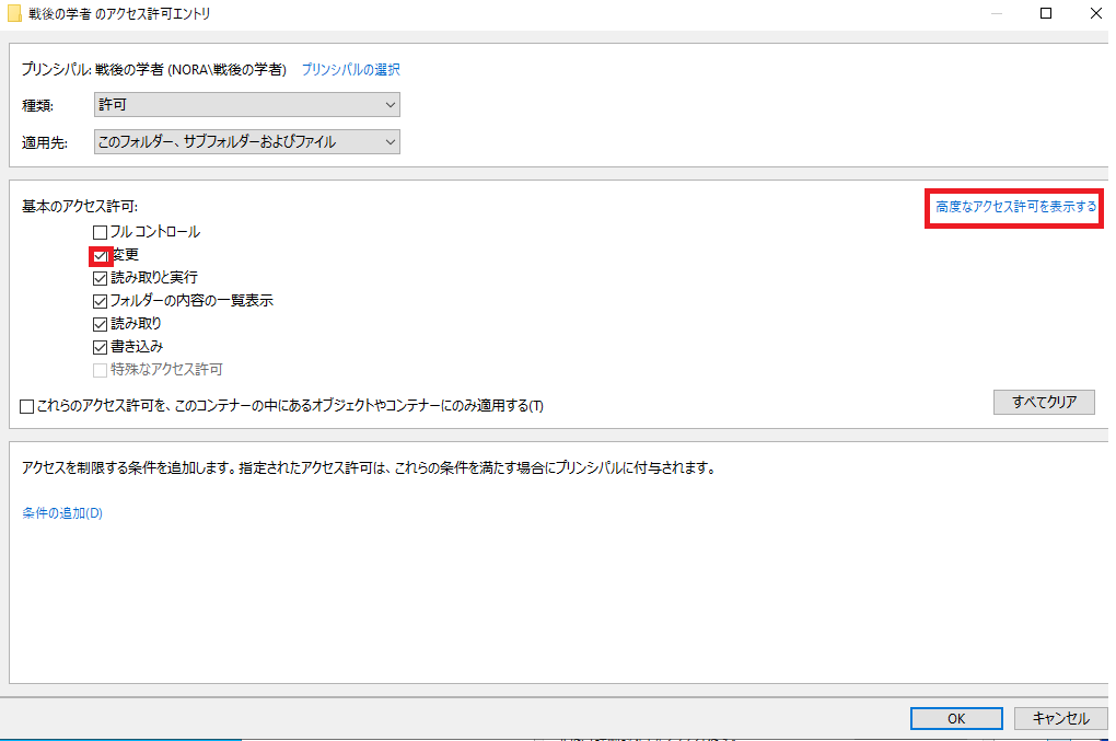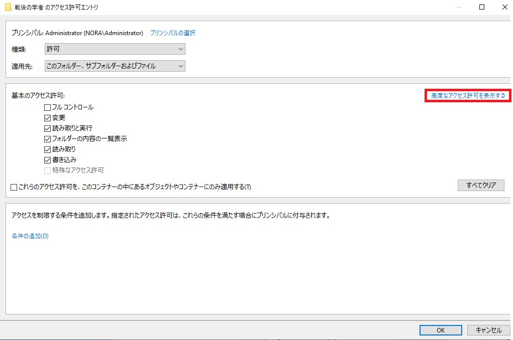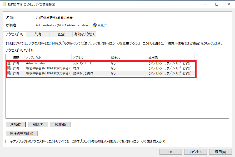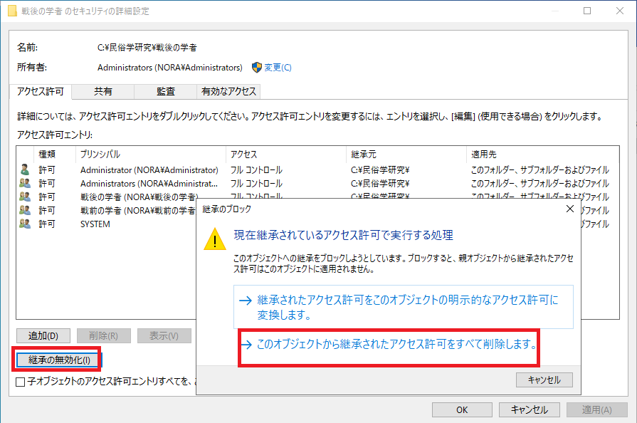 (24)上記の様なアクセス許可が必要な旨が表示され、「戦前」フォルダー内では書き込みが出来ないこと(書き込み権限が無い)を確認します。
