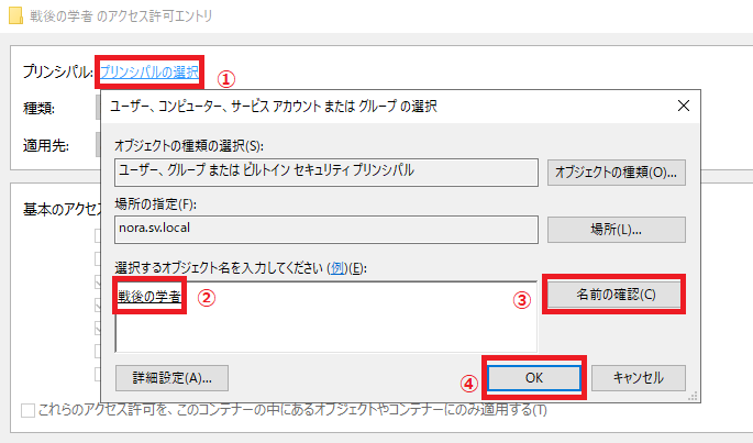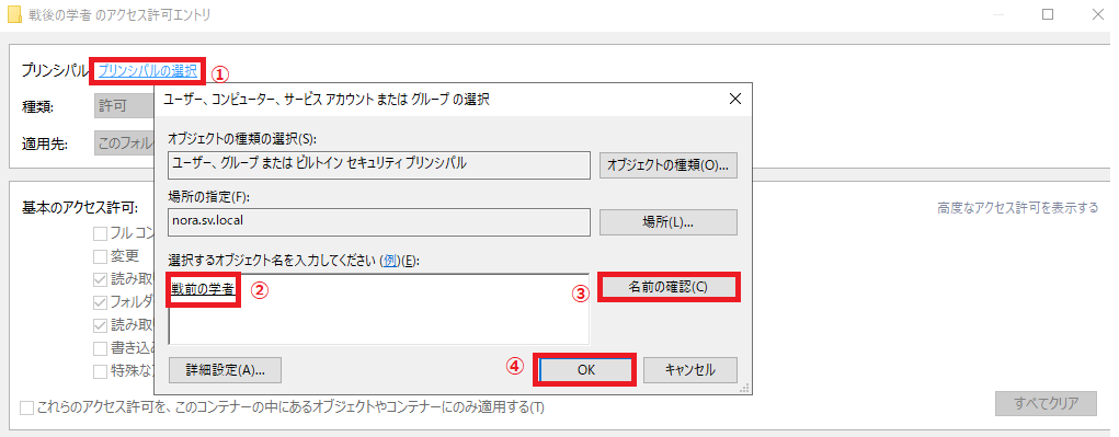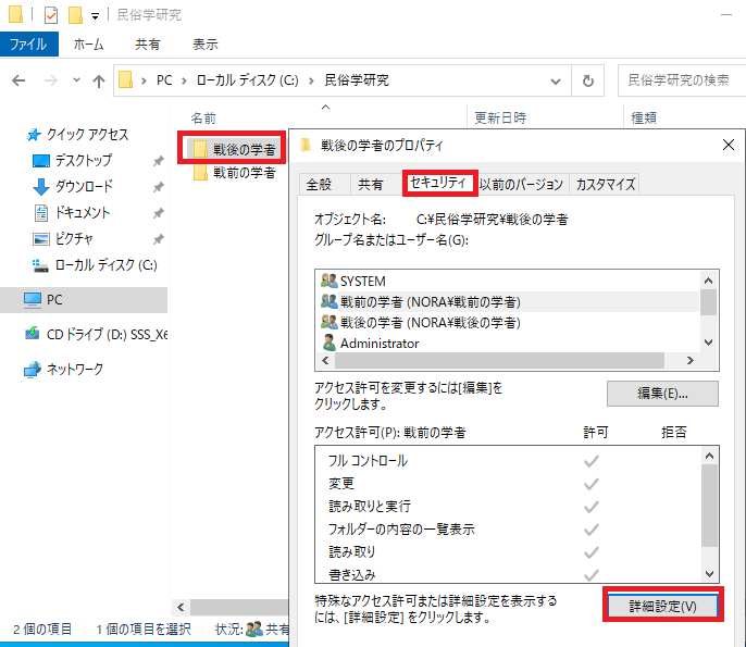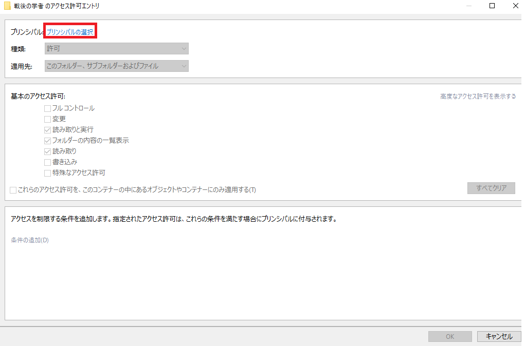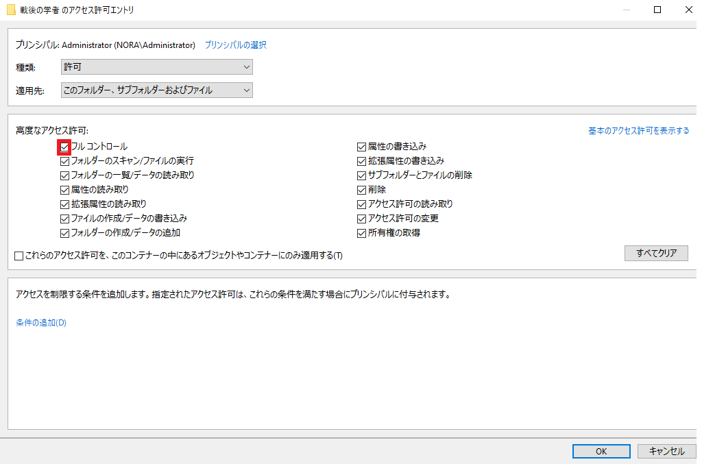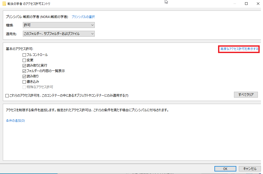 (24)上記の様なアクセス許可が必要な旨が表示され、「戦前」フォルダー内では書き込みが出来ないこと(書き込み権限が無い)を確認します。