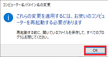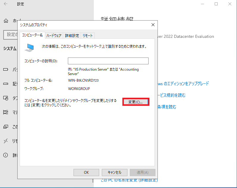 ⑵Windowsのスタートメニューから「設定」>「システム」>「詳細情報」>「このPCの名前を変更」をクリックし、上記画像の「システムのプロパティ」画面を起動し、「変更」をクリック。