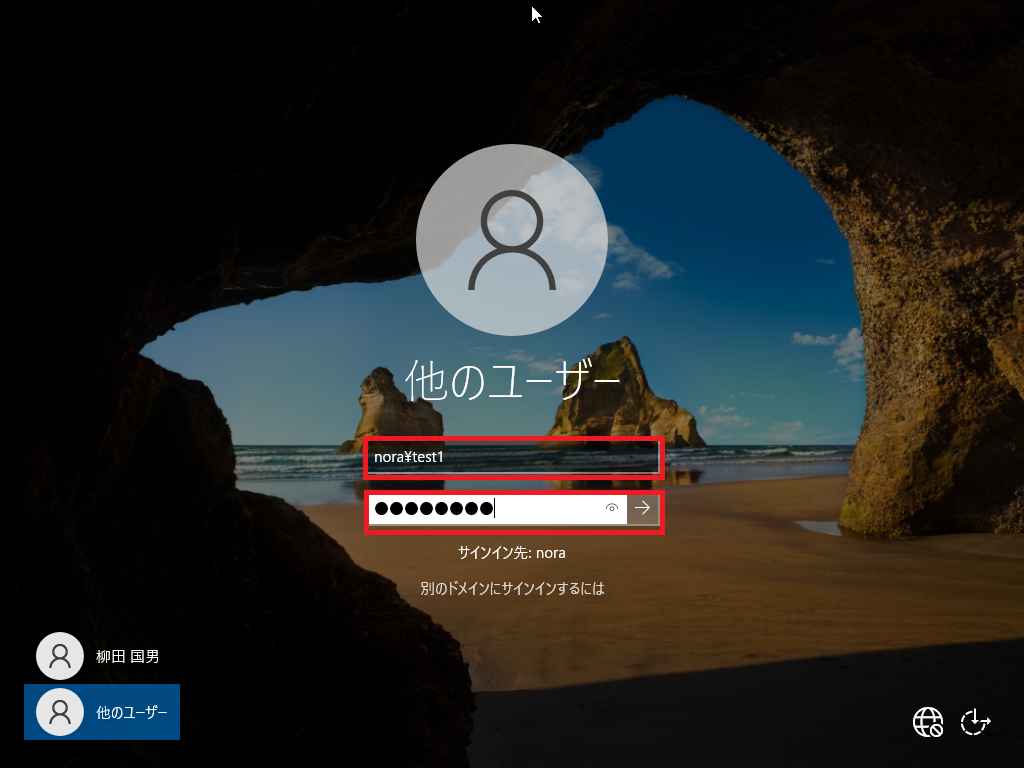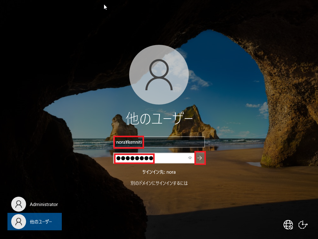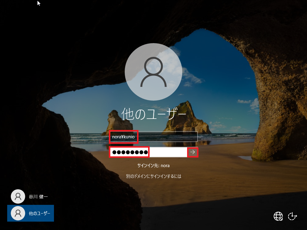 (40)ログイン画面で「nora¥test1」ユーザーアカウントとパスワードを入力し、→でログインします。