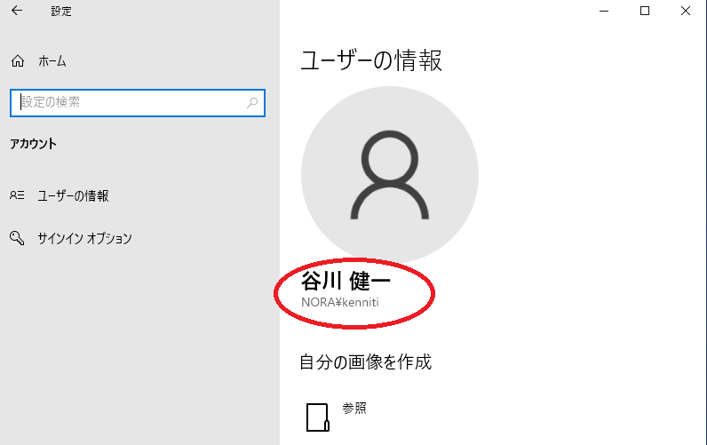 ⑽Windowsのスタートメニューから「設定」>「ホーム」>「アカウント」で上記の「ユーザー情報」画面を起動し、ログインしたユーザーアカウント「NORA¥kenniti」名前「谷川健一」であることを確認します。