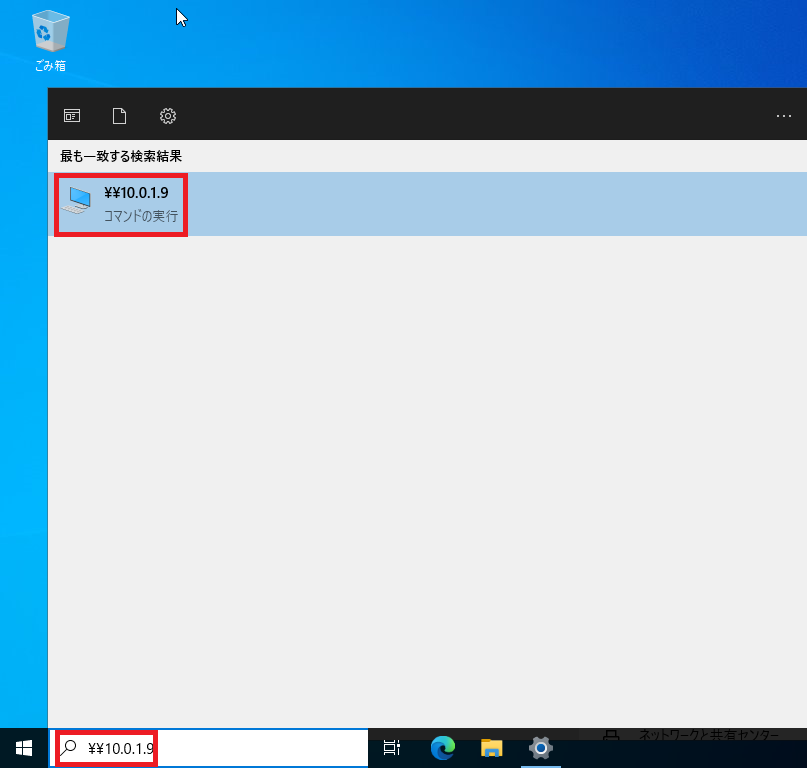 ⑾「スタートボタン」となりの「ここに入力して検索」というテキストボックスに共有フォルダを設定したサーバー(ここでは¥¥10.0.1.9)を入力し、「最も一致する検索結果」に該当するサーバが表示されるので、クリックします。