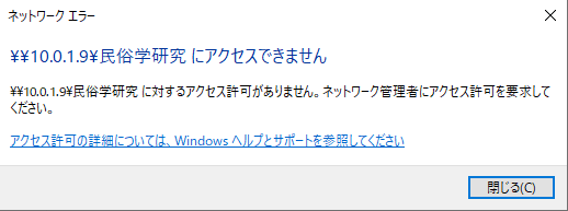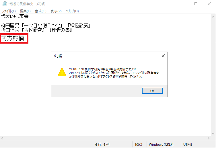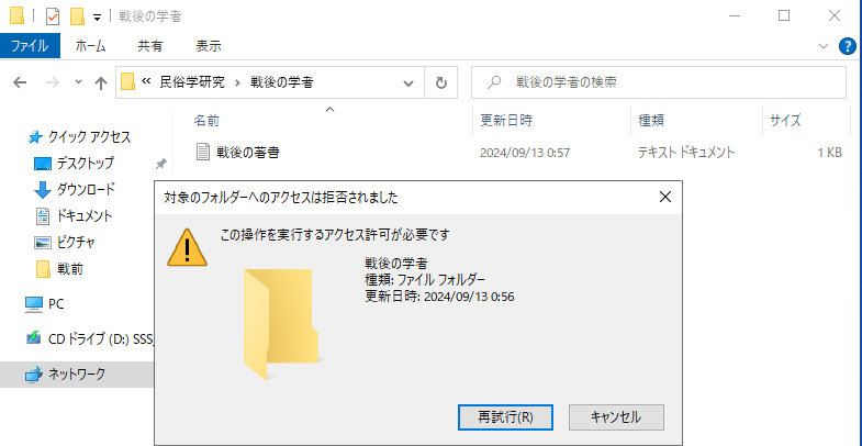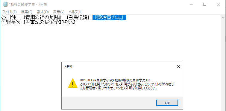 (36)上記の様に「戦後の民俗学史」テキストファイルに追記(内容は何でも構いません)し、上書き保存すると、アクセス許可が必要な旨が表示され、「戦後」フォルダー内では書き込みが出来ない(書き込み権限が無い)ことを確認後、「戦後の民俗学史」を閉じます。