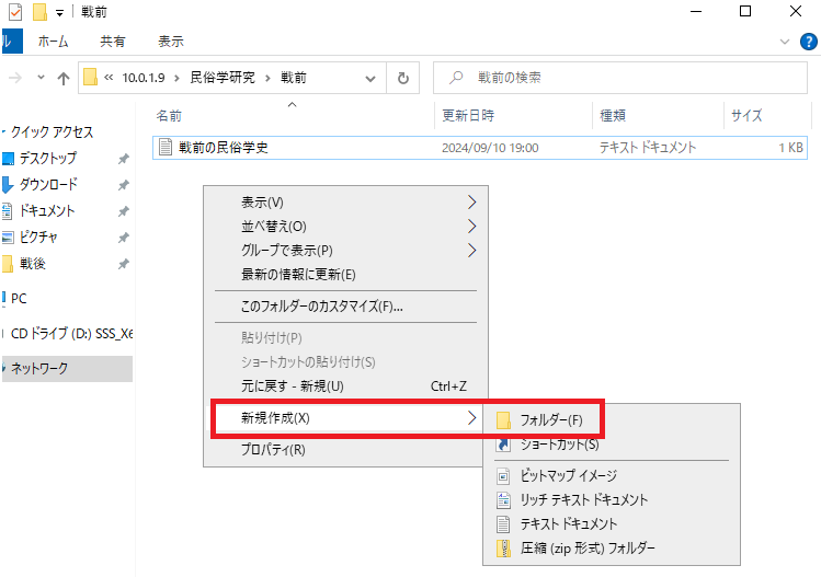 (23)「戦前」フォルダー内で右クリックし、「新規作成」」>「フォルダー」をクリックします。