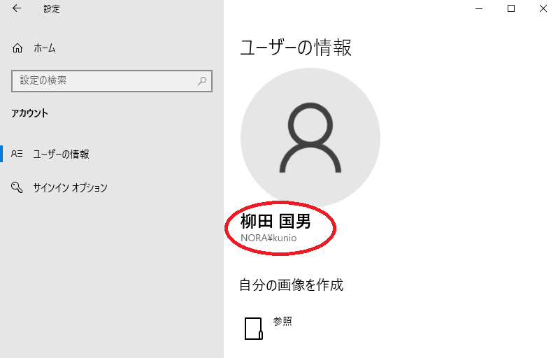 (27)Windowsのスタートメニューから「設定」>「ホーム」>「アカウント」で上記の「ユーザー情報」画面を起動し、ログインしたユーザーアカウント「NORA¥kunio」名前「柳田国男」であることを確認します。