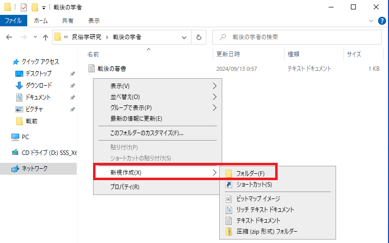 (31)「戦前」フォルダー内で右クリックし、「新規作成」>「フォルダー」でフォルダーを作成します。